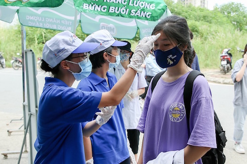 Đội ngũ sinh viên tình nguyện tập huấn công tác kiểm tra thân nhiệt vòng ngoài cho thí sinh. Ảnh: Thế Đại